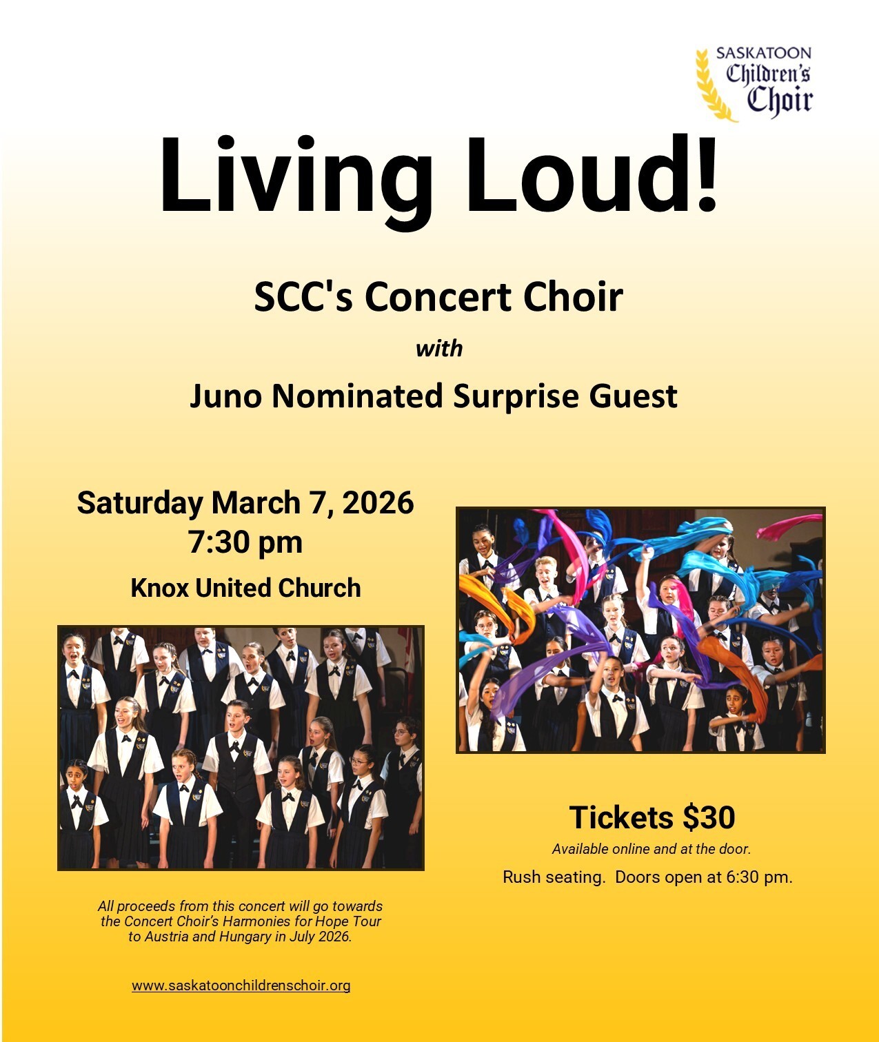 Experience Living Loud! An electrifying evening with SCC’s Concert Choir and a surprise Juno-nominated Canadian guest artist. Join us for a night of powerful music in support of the Concert Choir’s Harmonies for Hope tour this July.